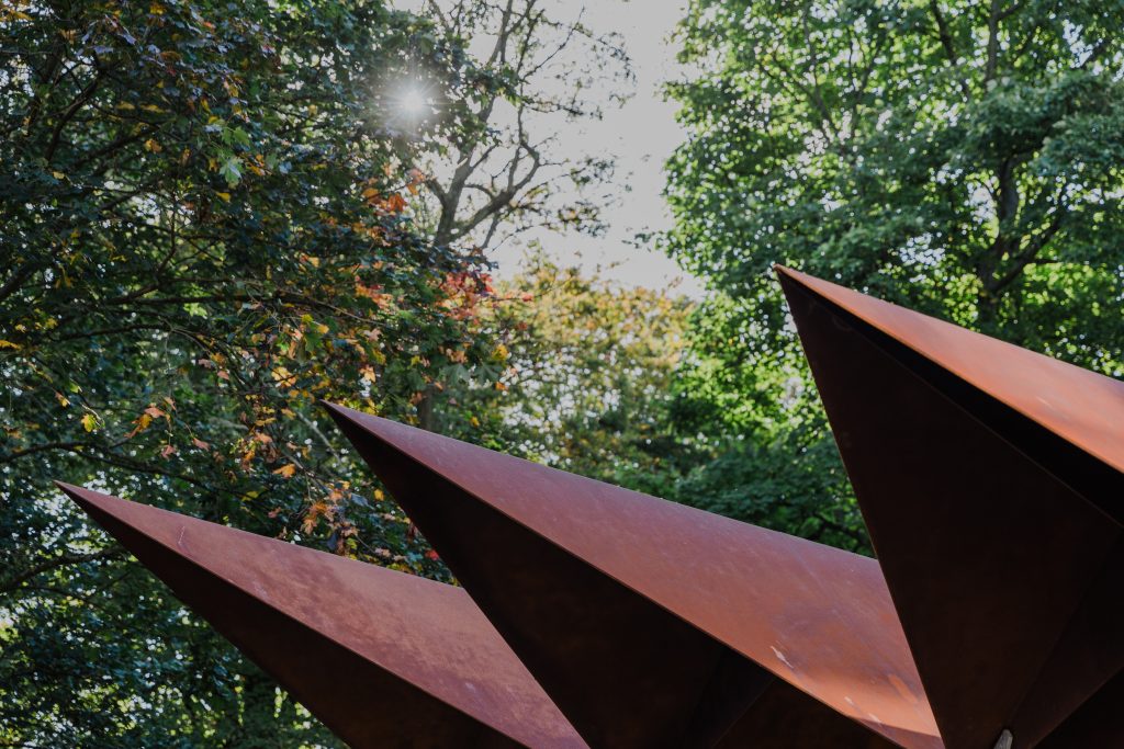 Katie explained that the concept for the pavilion, which arose from the workshops with the pupils, has deep rooted foundations in the Quaker religion, its ethos, core values and symbolism. The canopy design, with its folded, origami-esque formation of sharply folded, sculptural Corten steel, represents a considered deconstruction of the 8-pointed Quaker Star, a symbol of Quaker Service since the late 19th century. This tessellated roof structure, with its distinctive, weatherproof and minimal maintenance finish, provides a dramatic, undulating form.