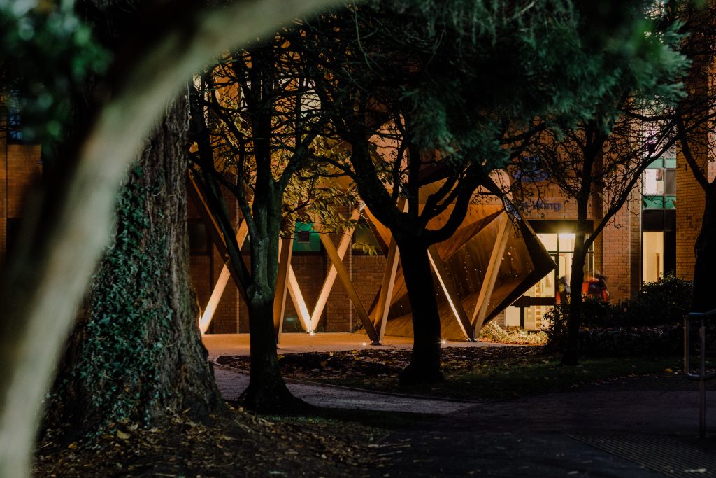 The six, angled, iroko-clad piers which support this canopy express the ‘leaning and folding together of community.’ Inspired by the pupils’ ideas, these piers provide a reference to the six Quaker values that are the core foundation of the religion: simplicity, peace, integrity, community, equality and stewardship of the earth.