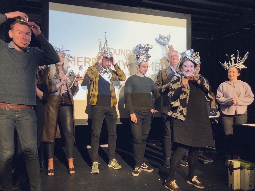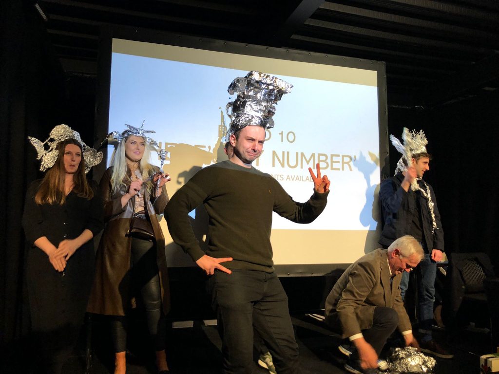 As standard, there were also building challenges. One of the many spot prizes awarded on the night by RSUA’s Ciarán “Fastest Finger First” Fox was for the winner of the ‘tin foil hat challenge’. Each team was asked to craft their best and most stylish metallic millinery and showcase them on the catwalk. Fashionista (and RSUA President) Donal MacRandal, chose the most fashion-forward candidate who won a prize.