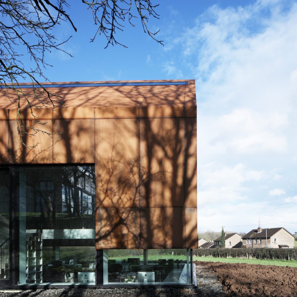 This studio is set within the garden of the architects award winning house in the gently rolling countryside south of Kilrea, and is composed of a modestly scaled single form referencing and continuing the tradition of metal skinned agricultural sheds, barns and outbuildings which prevail throughout the local countryside. The programme required a studio space for their growing practice, which until now had occupied a dedicated but small space within their home, along with a garage and an accessible guest suite.