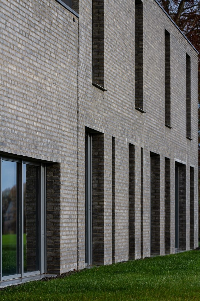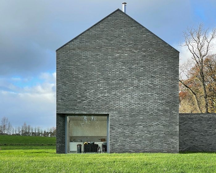 The home is deferential to its natural surroundings and takes the form of the agricultural out-buildings. For a relatively large home it nestles effortlessly in the landscape. Hand-made bricks in hues of grey and a zinc roof help the dwelling harmonise with the dark trees beyond.