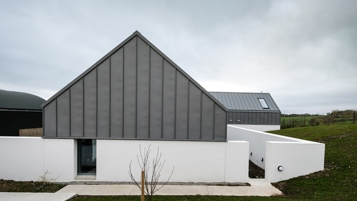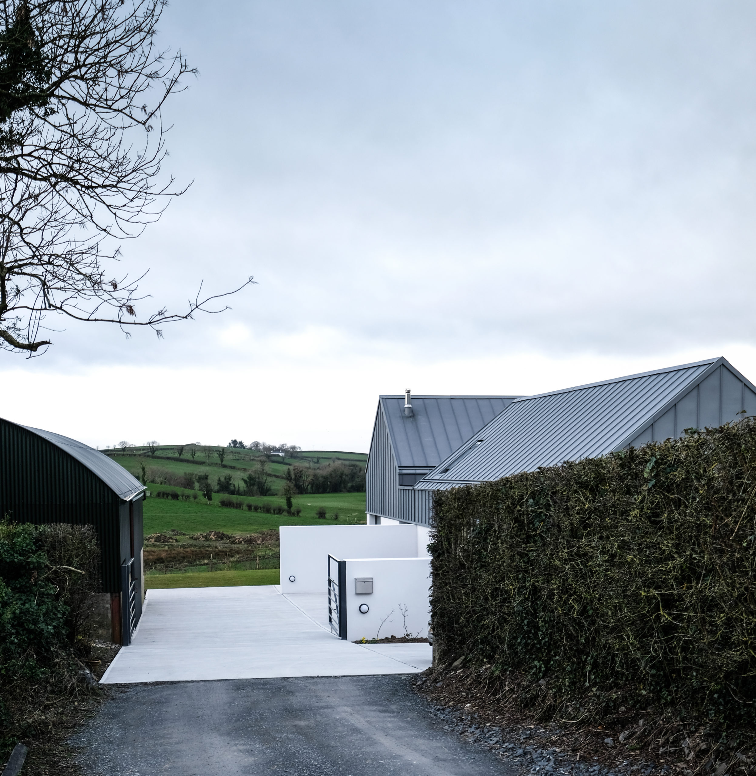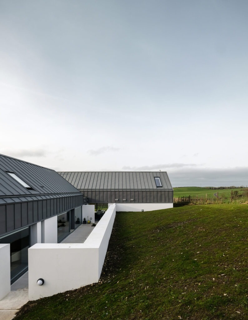 A beautiful new house sits within a carefully orchestrated architectural ensemble formed of an existing barn, a new fore court, a discrete bedroom block with private courtyard and expansive living spaces which look out onto a wonderful green rolling landscape.