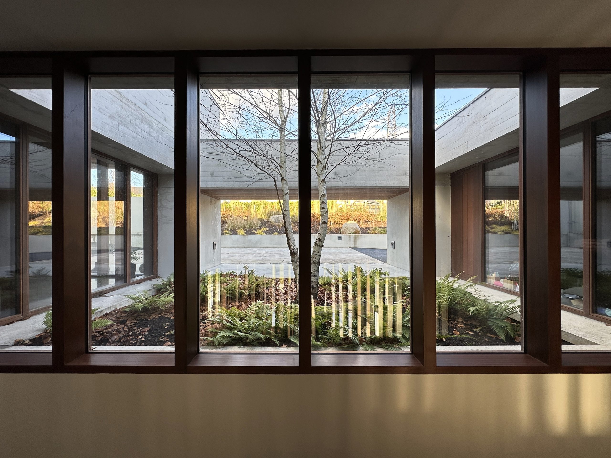 Longhurst’s architecture is urbane, courteous, and contemporary. Still, it carries an almost nostalgic air, alluding to a time long gone. There is perhaps a ghost of Ludwig Mies van Der Rohe’s design for the Villa Tugendhat (built in 1930 in the Czech city of Brno) in its horizontality and how it steps down the hill from the modest entrance to the glazed elevations overlooking the gardens. In contrast to that house, which appears lightweight through its material abstraction, Longhurst is characterised by a sense of weight and materiality through its in-situ concrete, dark timber, and smooth render. There is no doubt that Longhurst can sit within the canon of significant modern houses.