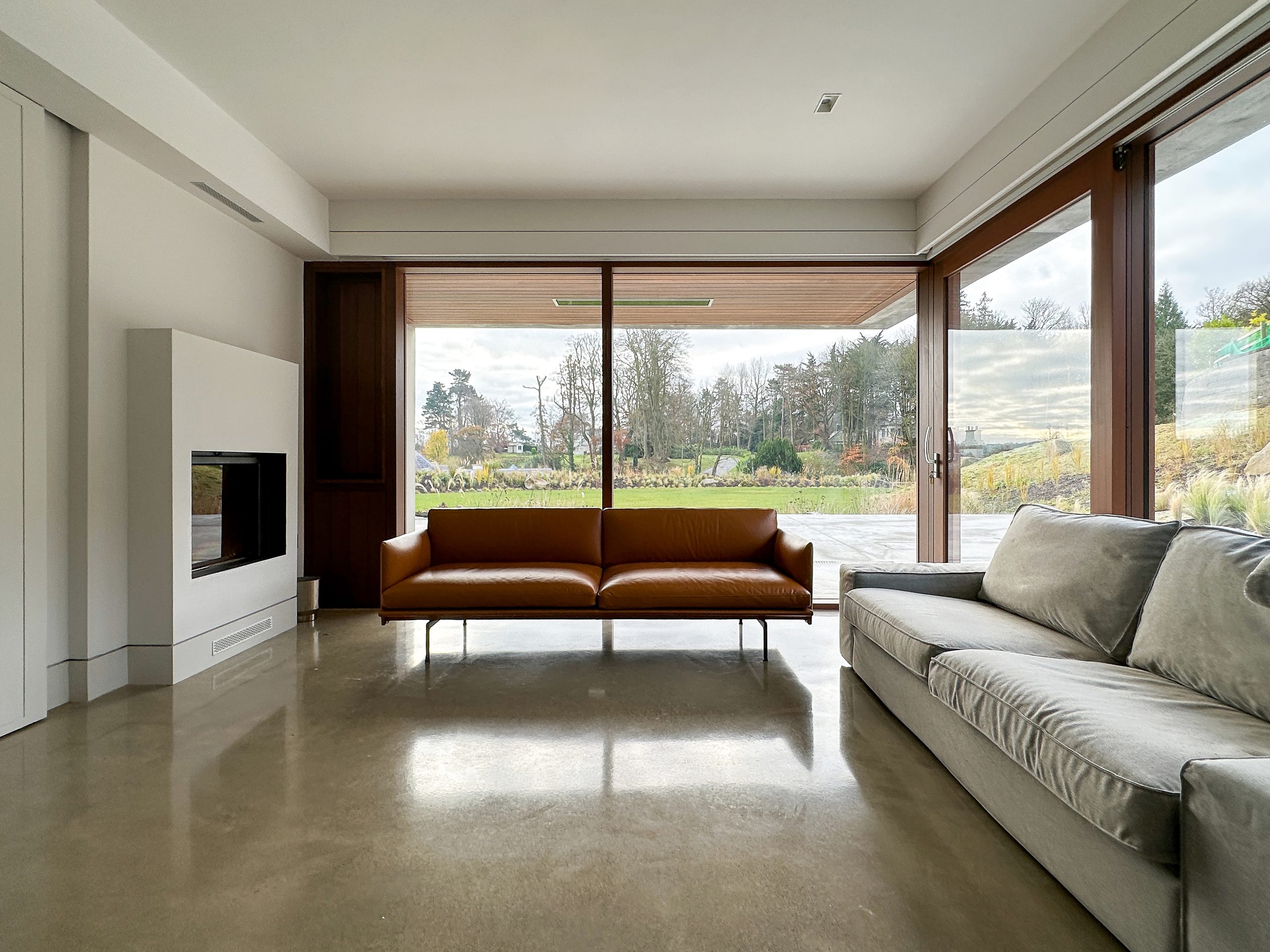 Longhurst is a substantial new villa in a residential area on the southern outskirts of Belfast. In contrast to its more traditionally designed neighbours, which stand assertively and distantly at the centre of their large plots, Longhurst is a fine exploration of a modern house that is generated by and responds to the topography and orientation of the site. The architects have skilfully orchestrated a beautiful unfolding sequence of spaces that begin with a modestly scaled, almost Japanese entry courtyard, then carefully step down the slope to finally open out to expansive living spaces, terraces, and lawns to the south. The design hides the villa’s scale from external gaze, presenting an almost mute expression to the access lane, while the glazed, garden-facing south elevation reveals its sheer generosity. The quality of detail, materials, and construction is exemplary. This is clearly a house for relaxation and entertaining friends on a grand scale.