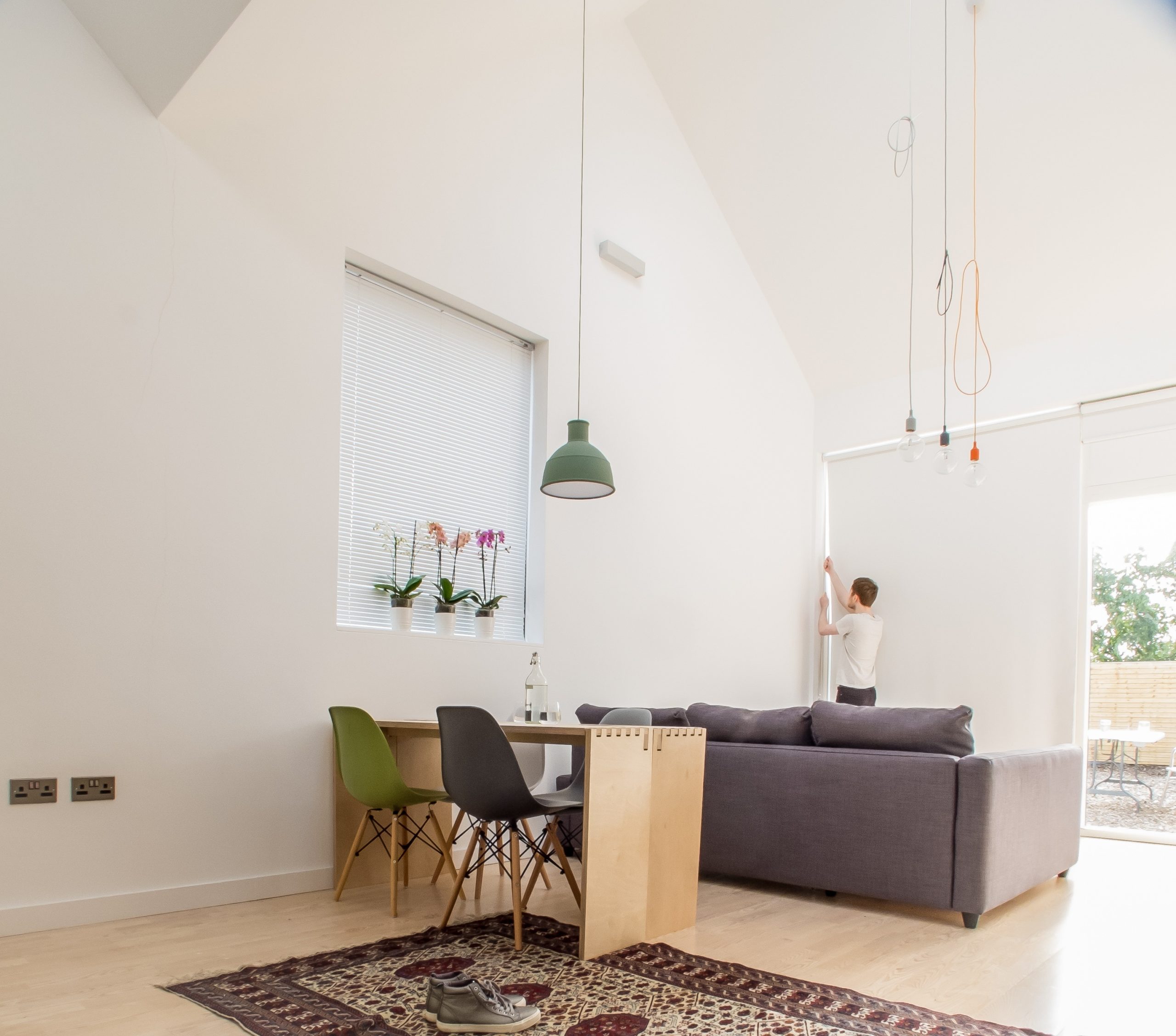 There were design challenges. The concern that small living means claustrophobic living and so views are generated between the spaces and on through the south facing window wall into an outside garden.