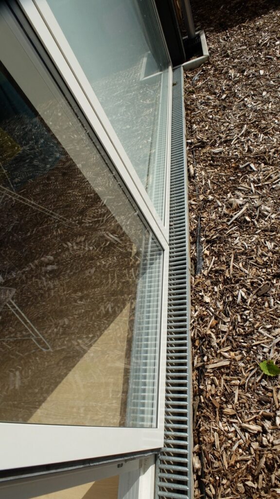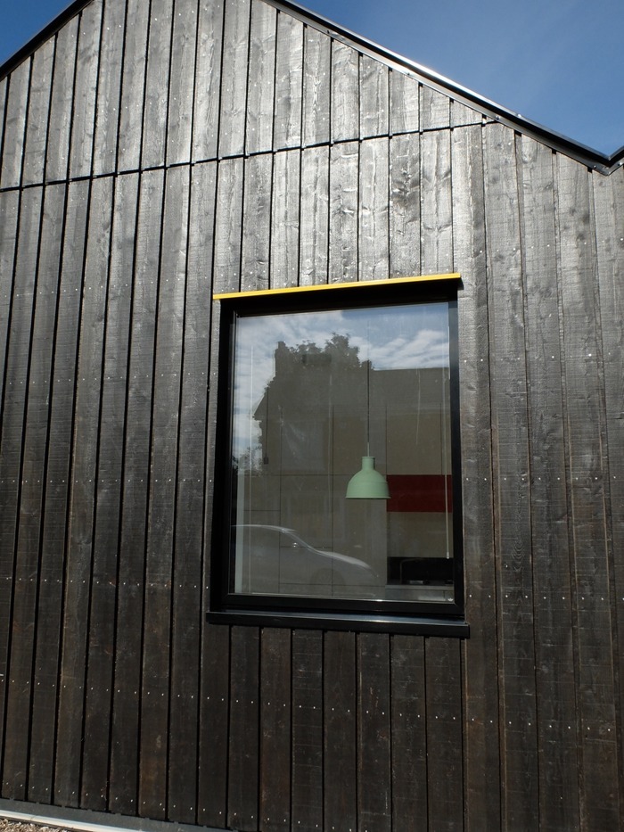 Utility boxes and other flotsam that appears on regular dwellings is accepted, in black where possible, but was controlled by the architecture including the bright metal rainwater downpipes subtly offset as sculptural elements.